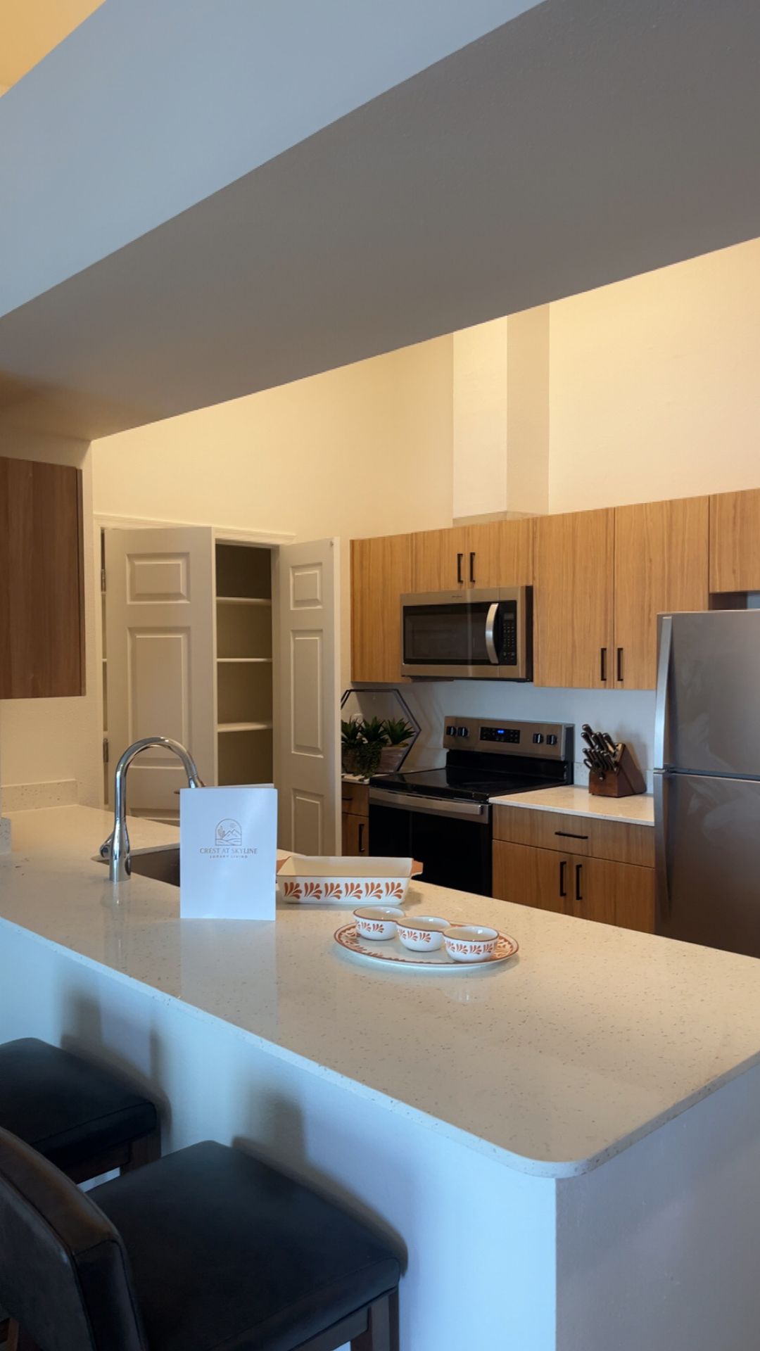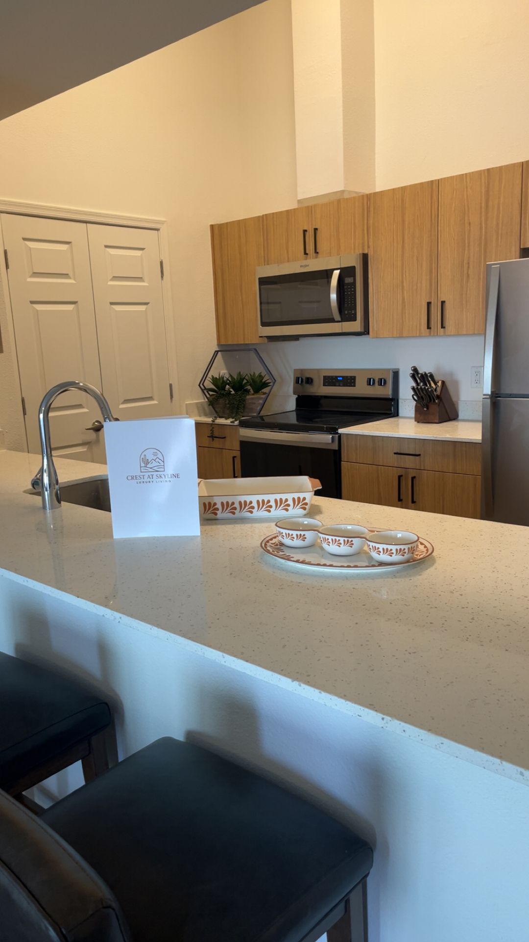 Welcome to The Crest at Skyline, a brand-new luxury apartment community in Mesa offering spacious 3-bedroom homes designed for modern living. Enjoy upscale features like full-size in-unit washer & dryer, Cox Connect WiFi, large kitchen pantries, barn-style sinks, double vanities, and private patios. Select third-floor homes feature vaulted ceilings.